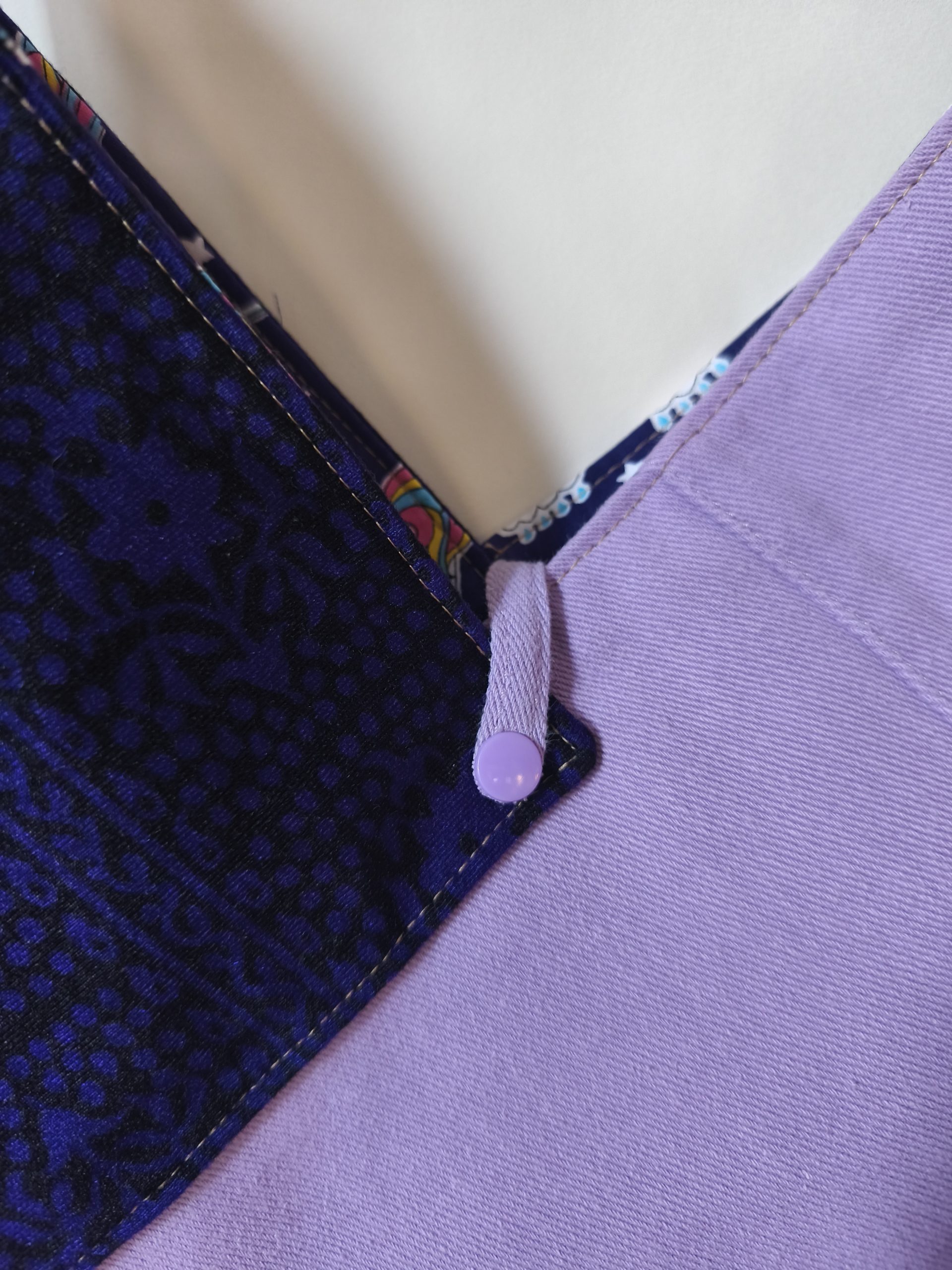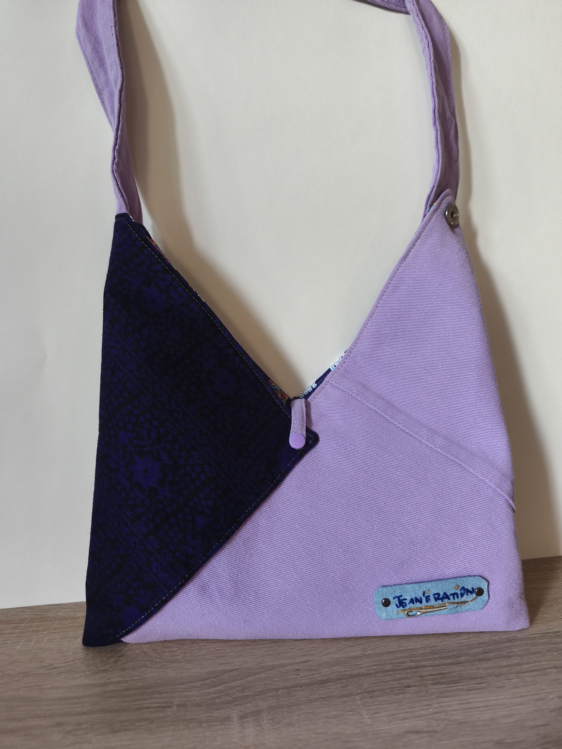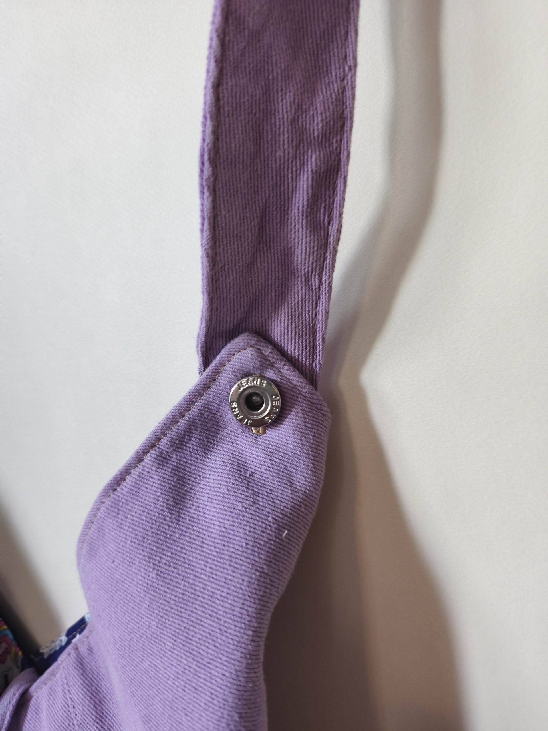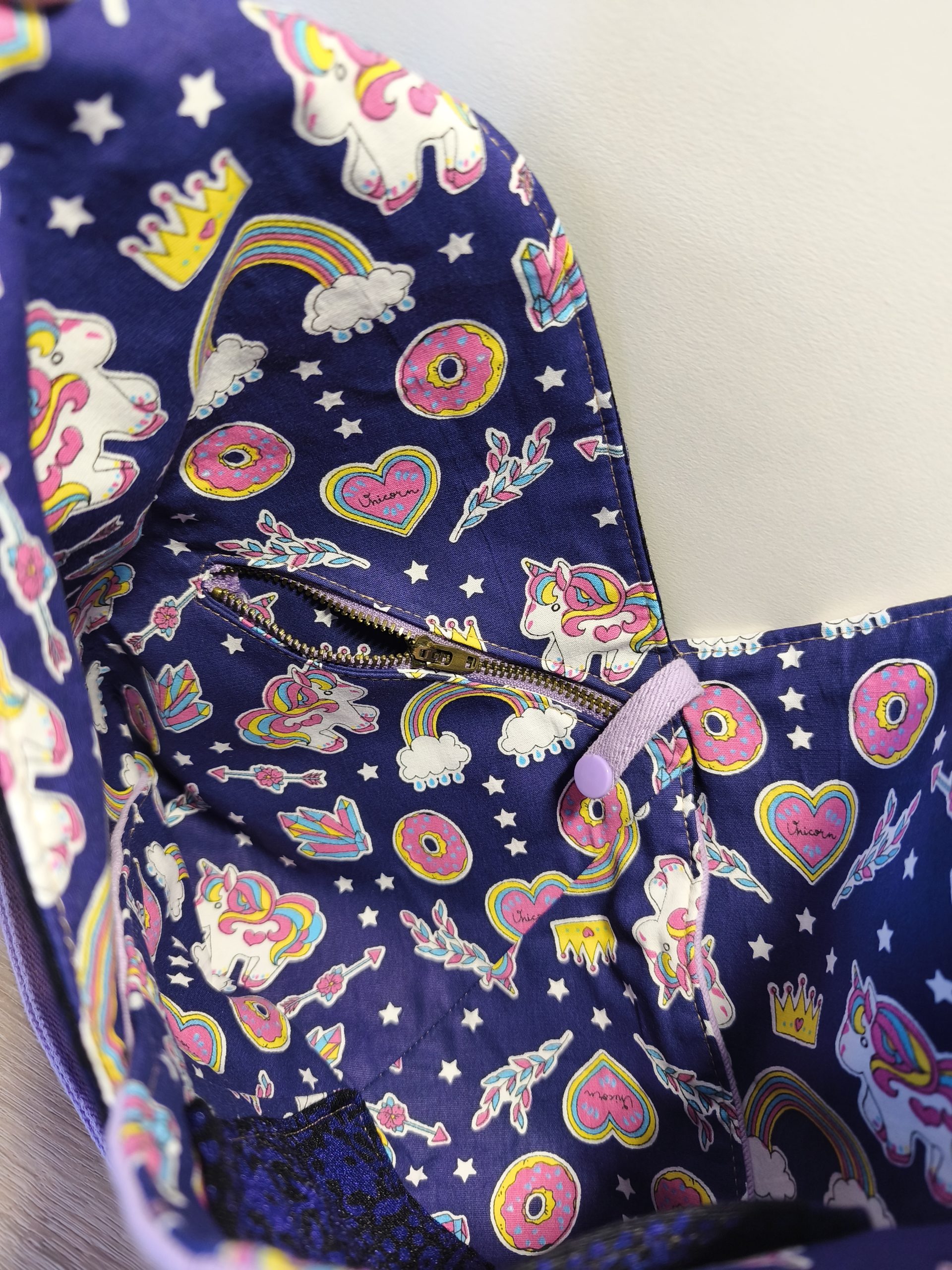 Le sac est composé d’un morceau de jean couleur violet-lilas ainsi que d’un tissu à formes géométriques violet et noir (c’était une robe de ma grand-mère mais chut!). La fermeture du sac se fait grâce à un passant de ceinture dont l’extrémité est agrémentée d’un bouton pression assorti. L’intérieur est entièrement doublé par un tissu violet décoré de licornes, arc-en-ciel et autres donuts colorés. On y trouve deux poches : l’une plaquée et l’autre zippée. Le zip de la poche correspond à la fermeture braguette du jean. La ceinture du jean a servi à réaliser la anse du sac.