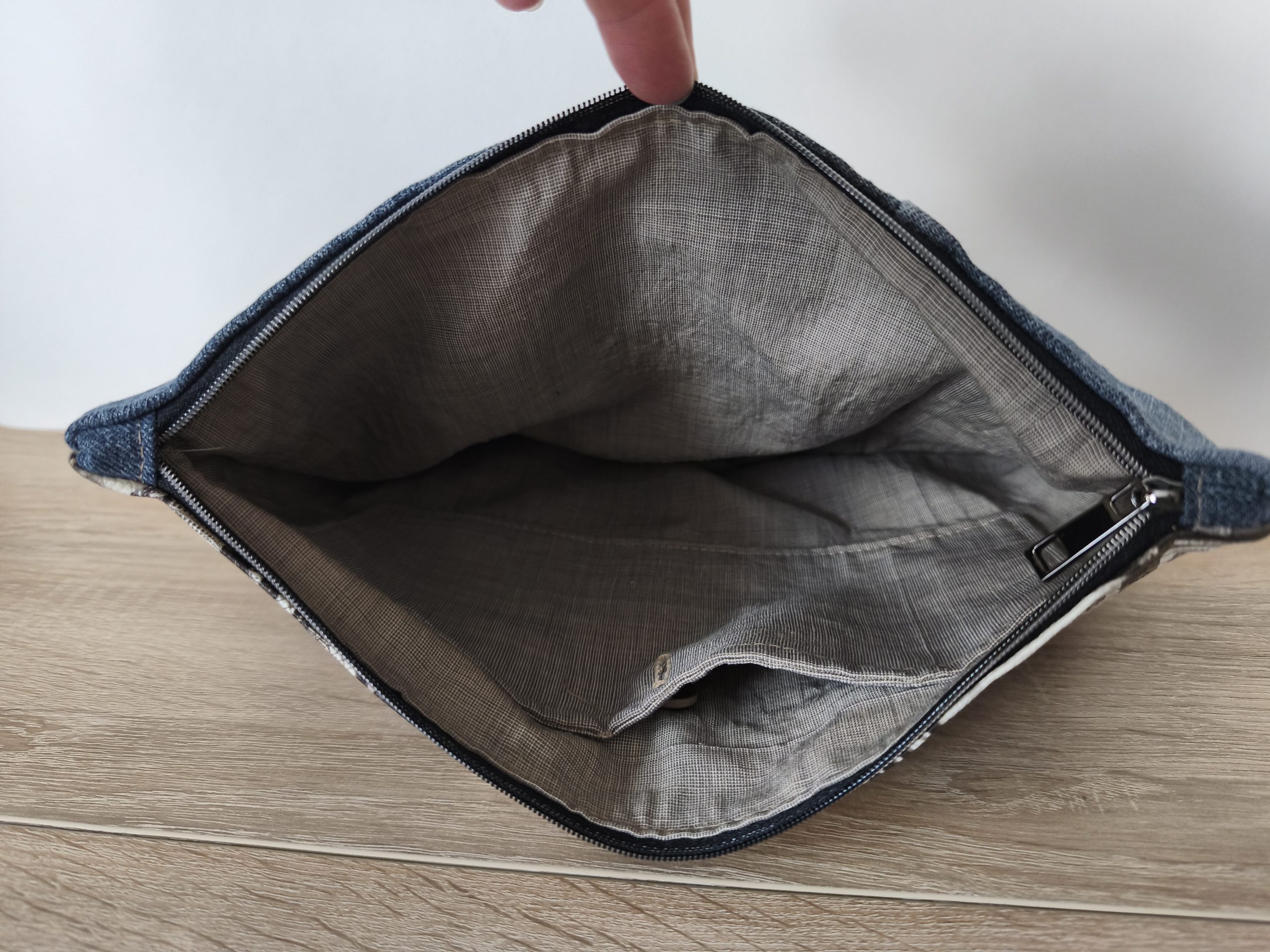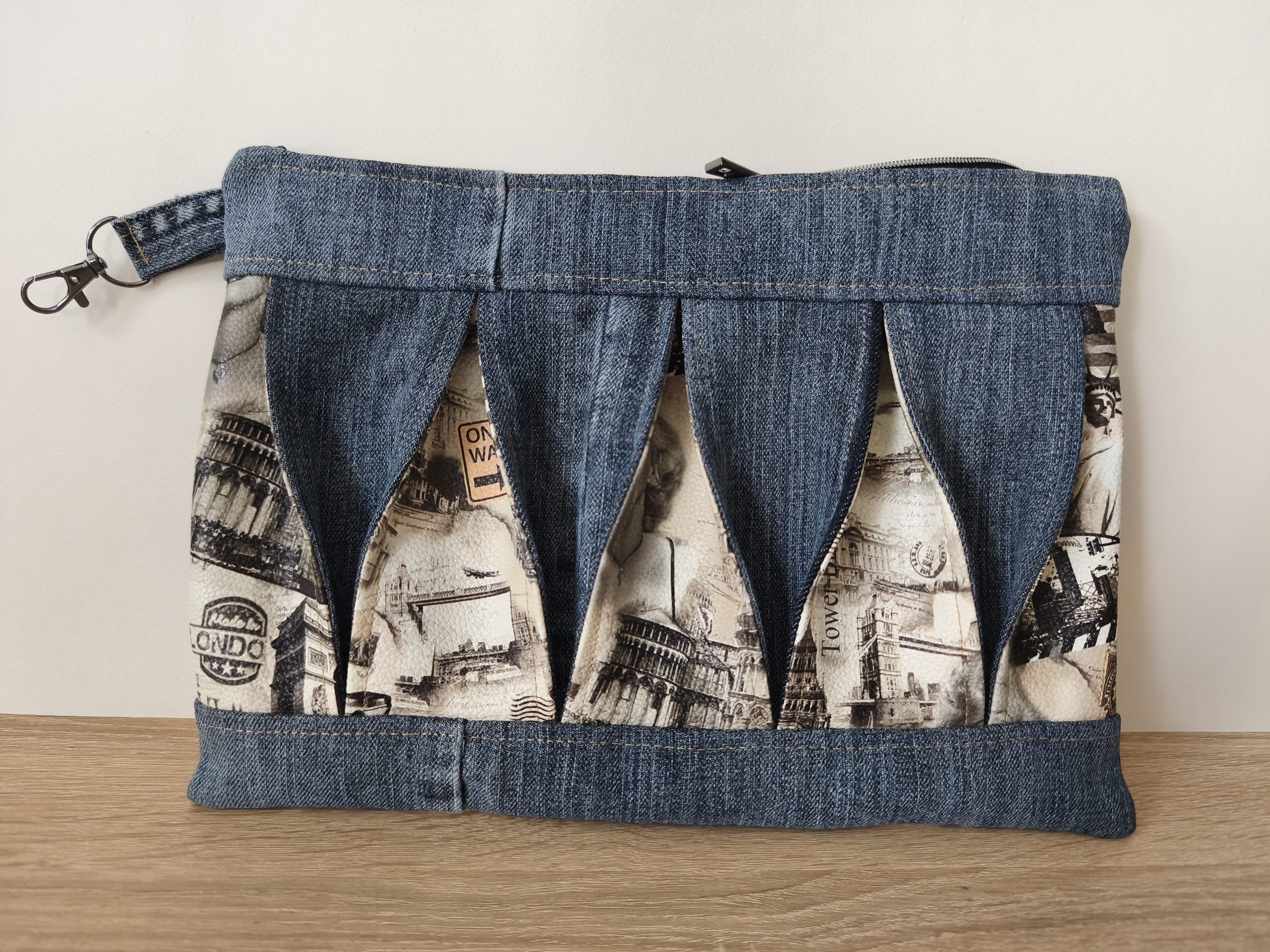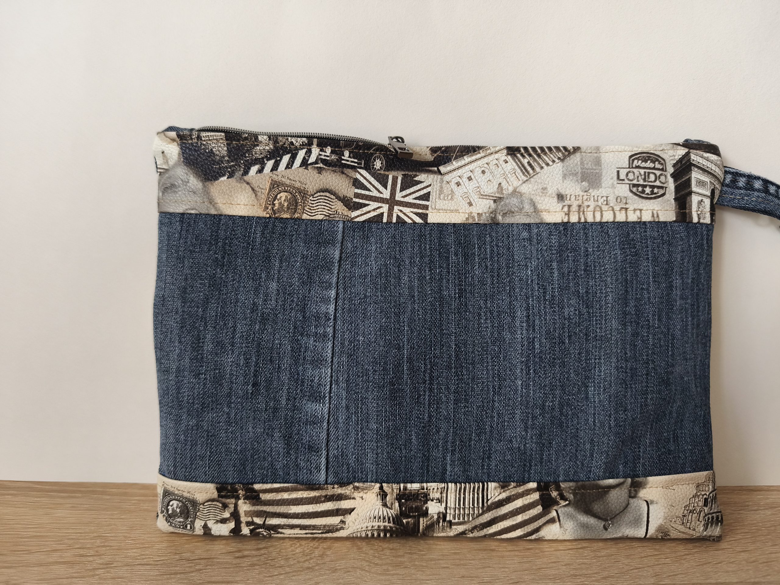 Extérieur : Jean bleu entoilé (pour une plus grande longévité du sac) et similicuir imprimé .